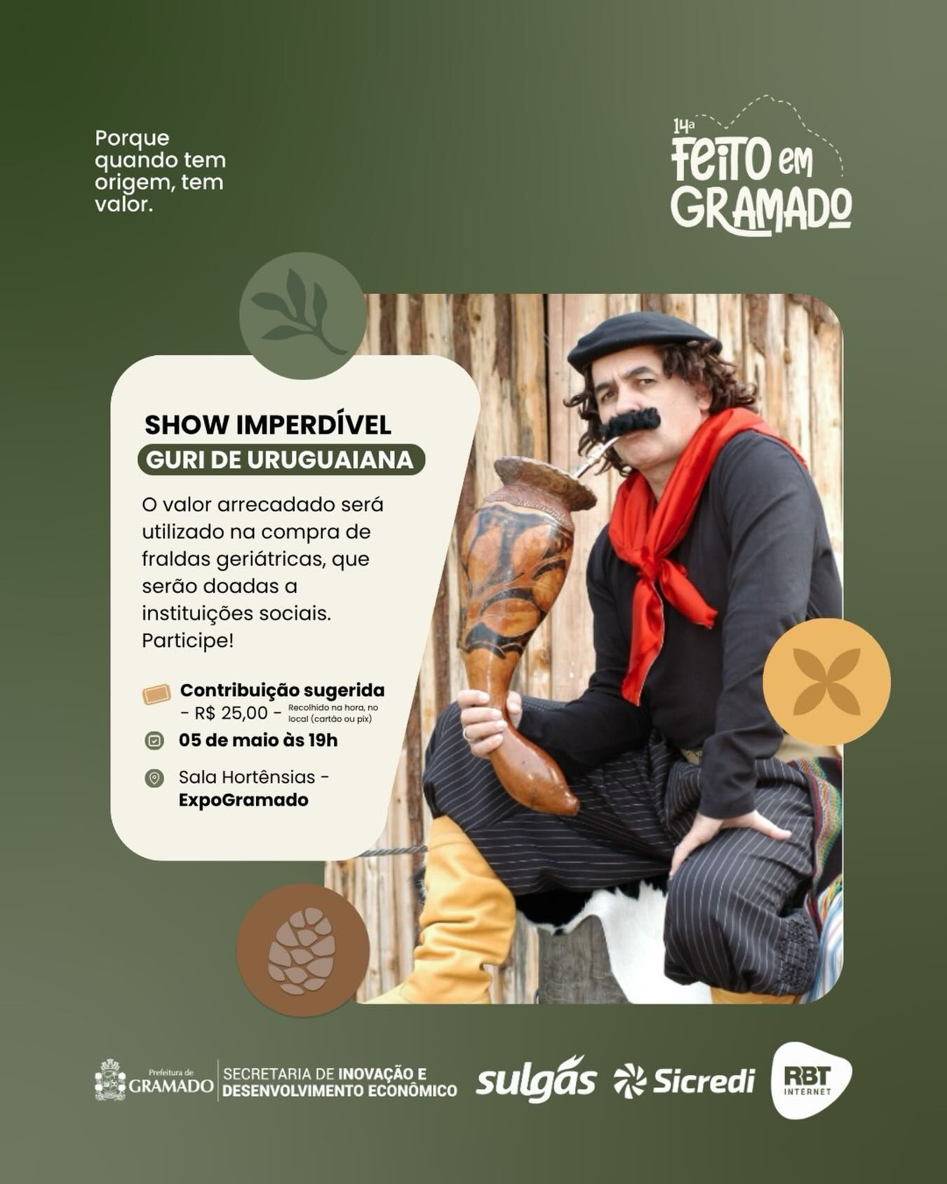 - Show com Guri de Uruguaiana: 5 de maio, às 19h. O ingresso solidário sugerido de R$ 25,00 será revertido para a compra de fraldas geriátricas para entidades assistenciais.