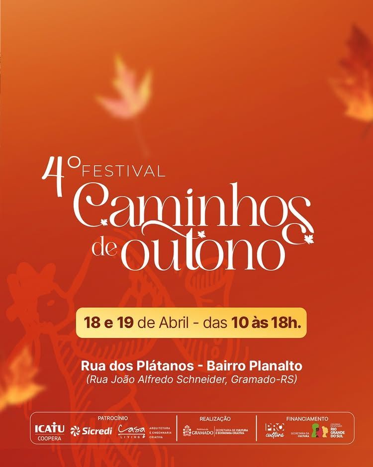 O 4º Festival Caminhos de Outono 2026 acontece nos dias 18 e 19 de abril, em Gramado (RS), reunindo uma programação cultural gratuita em meio às paisagens do outono na Serra Gaúcha. O evento será realizado na Rua João Alfredo Schneider, das 10h às 18h, transformando o local em um corredor artístico a céu aberto.