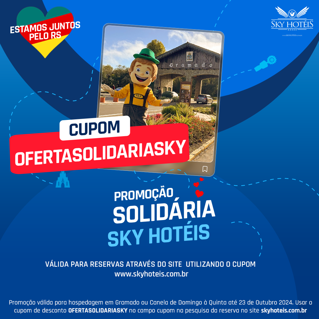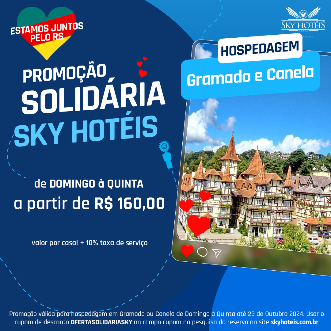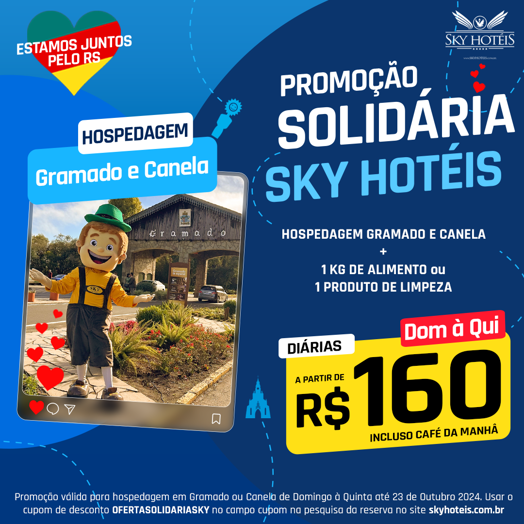Promoção válida para hospedagem de DOMINGO à QUINTA até 23 de Outubro de 2024 para reservas feitas pelo site www.skyhoteis.com.br com o cupom OFERTASOLIDARIASKY