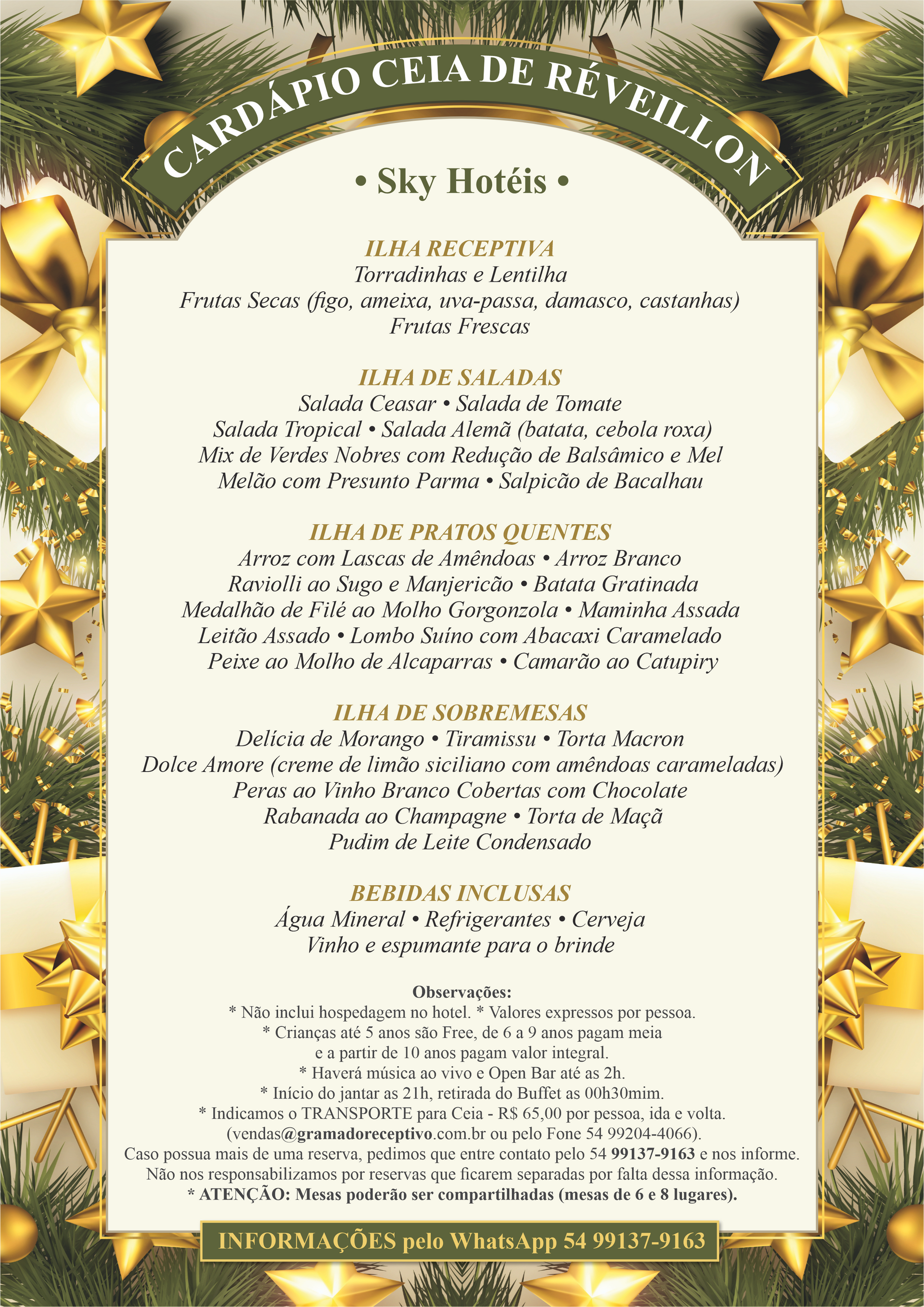 Prepare-se para receber o novo ano com muita animação na nossa Ceia de Réveillon. Teremos uma contagem regressiva emocionante, o espaço SKY KIDS GRATUITO para crianças de até 12 anos, música ao vivo para fazer você dançar a noite toda e, é claro, o nosso incrível Open Bar, garantindo que a diversão dure até às 2h da manhã!