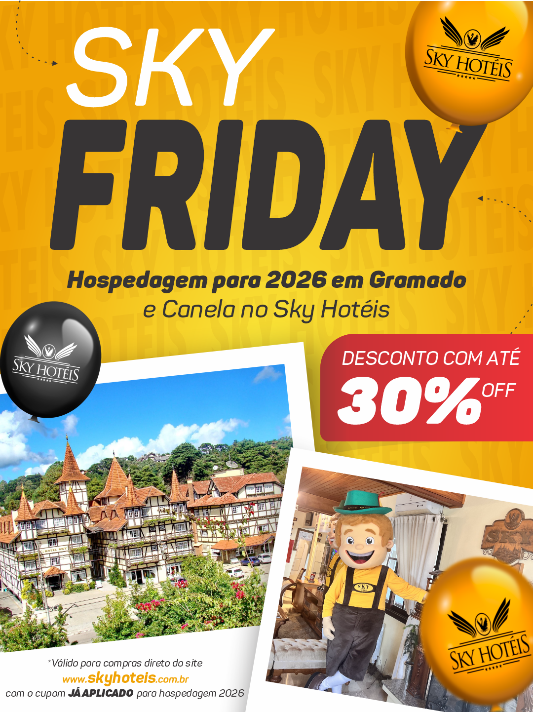 - ATÉ 30% OFF na HOSPEDAGEM é válido para compras direto no site www.skyhoteis.com.br com o cupom APLICADO AUTOMÁTICO para o período de hospedagem a partir de JAN até DEZ 2026.