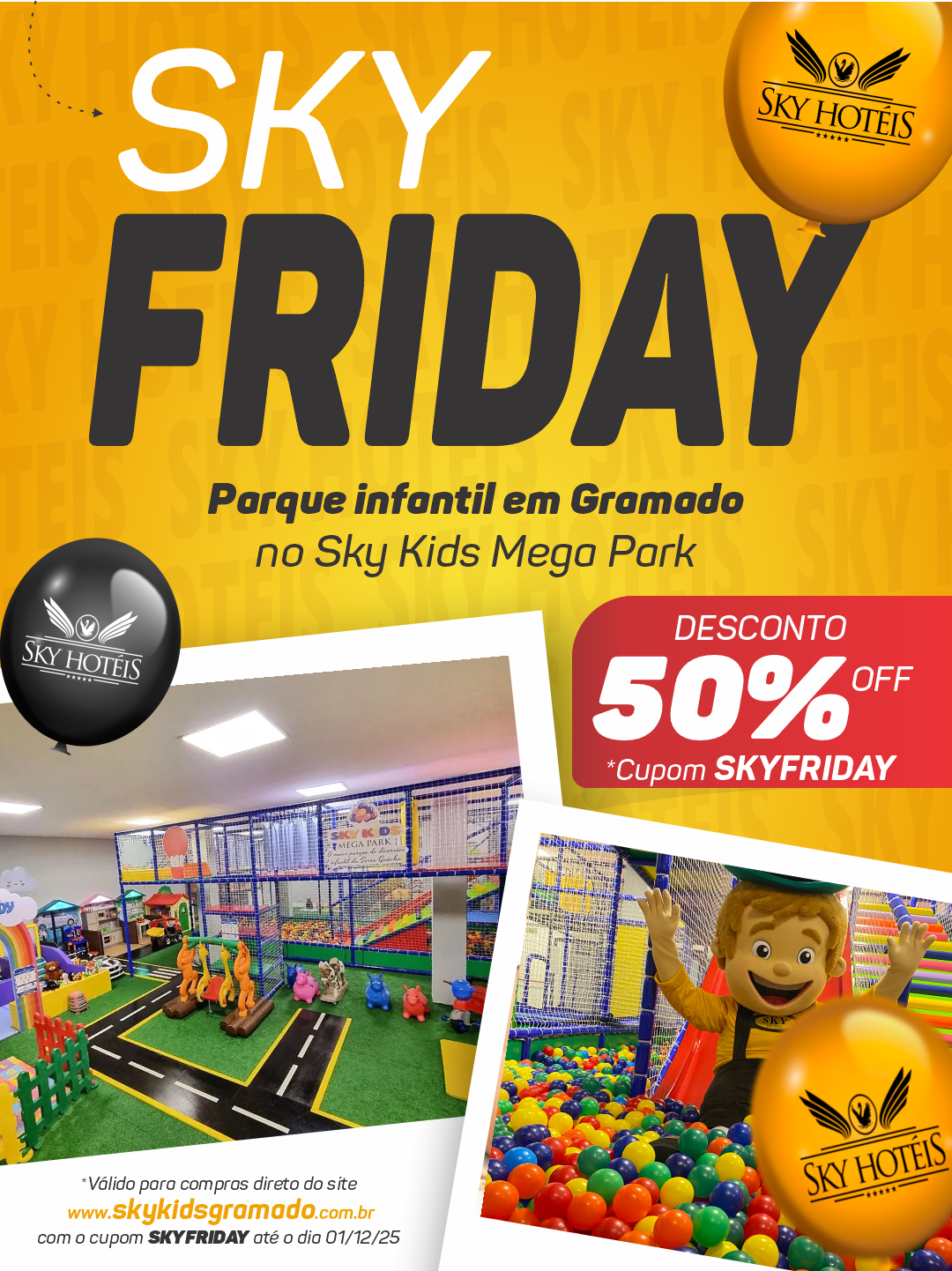 - 50% OFF no SKY KIDS é valido para compras direto no site www.skykidsgramado.com.br com o cupom SKYFRIDAY