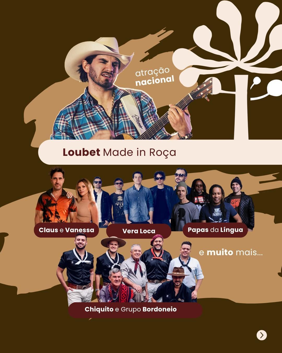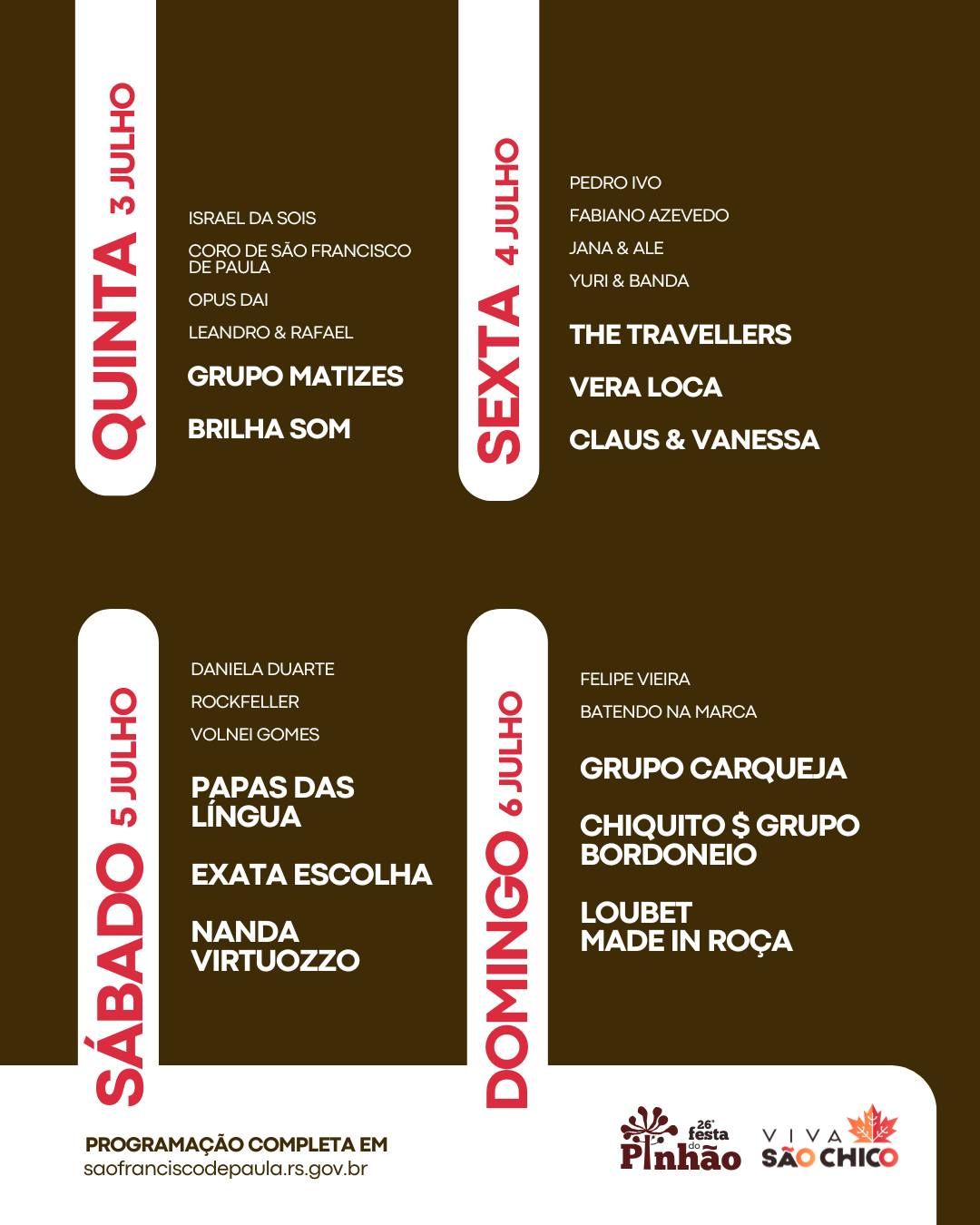 A nova estrutura do Centro de Eventos conta com praça de alimentação, feira de produtos locais e uma área especial para apresentações culturais, além da tradicional distribuição gratuita de pinhão. Os destaques na programação musical são Loubet – Made in Roça, Papas da Língua, Claus & Vanessa, Vera Loca e Brilha Som.
