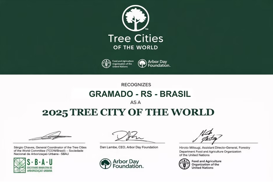 Atualmente apenas 283 municípios são certificados no mundo. No Brasil, são 51 cidades, e Gramado figura entre as três gaúchas reconhecidas pela FAO/ONU e pela Arbor Day Foundation como municípios que investem e consagram a arborização urbana como estratégia de gestão, promovendo a sustentabilidade, a proteção da paisagem, a conscientização da comunidade e a justiça climática.