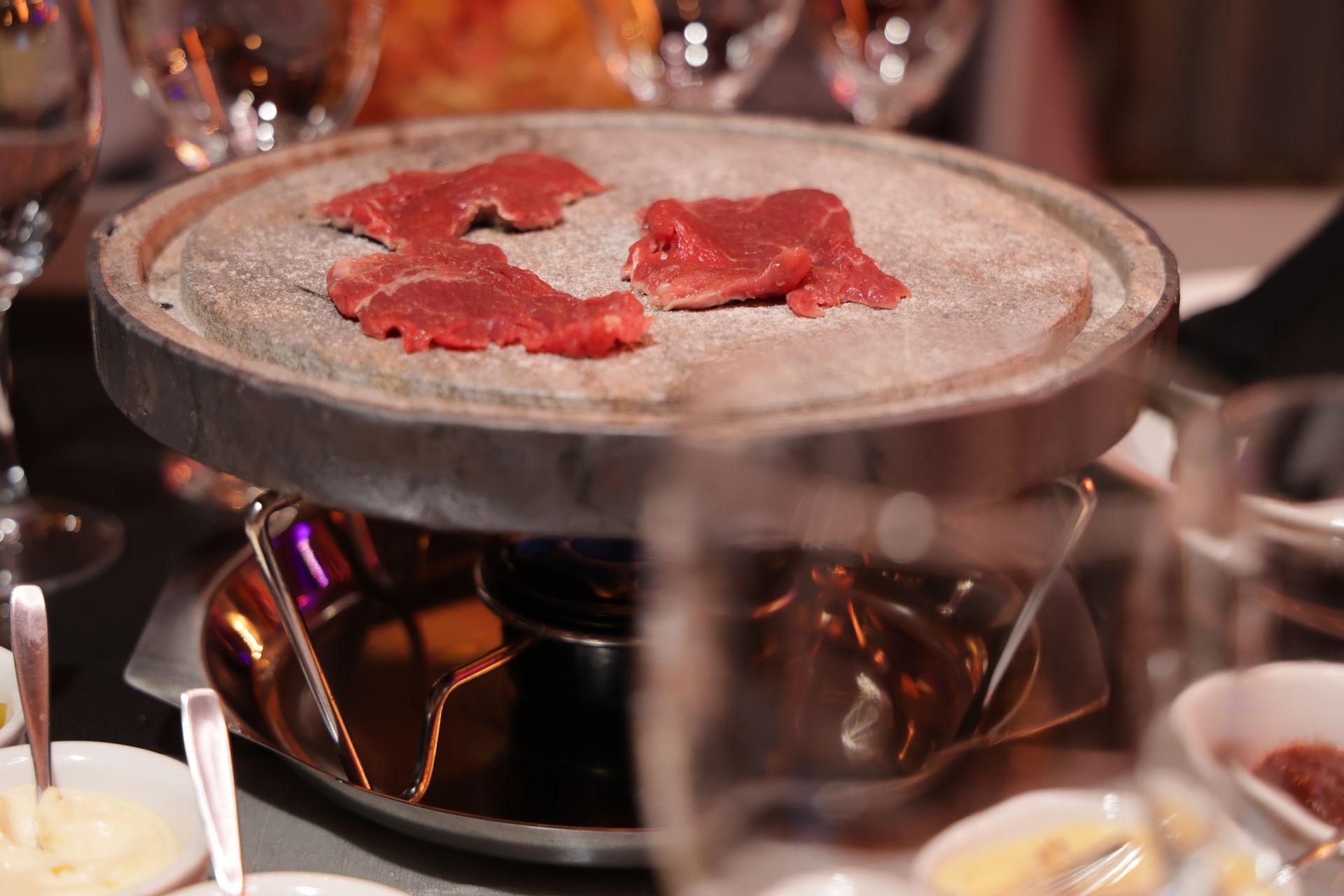 Fondue de Carne (na pedra): Filé Mignon, Lombo Suíno, Peito de Frango e doze opções de molhos.
