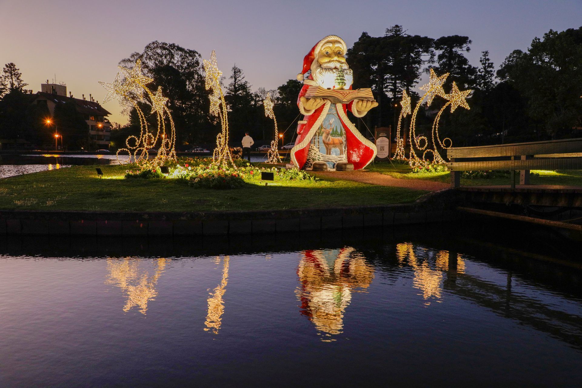 O lago, que serve de palco para este espetáculo, transforma-se em um cenário surpreendente, onde as águas encantam e os efeitos pirotécnicos vibram na mais pura emoção natalina.