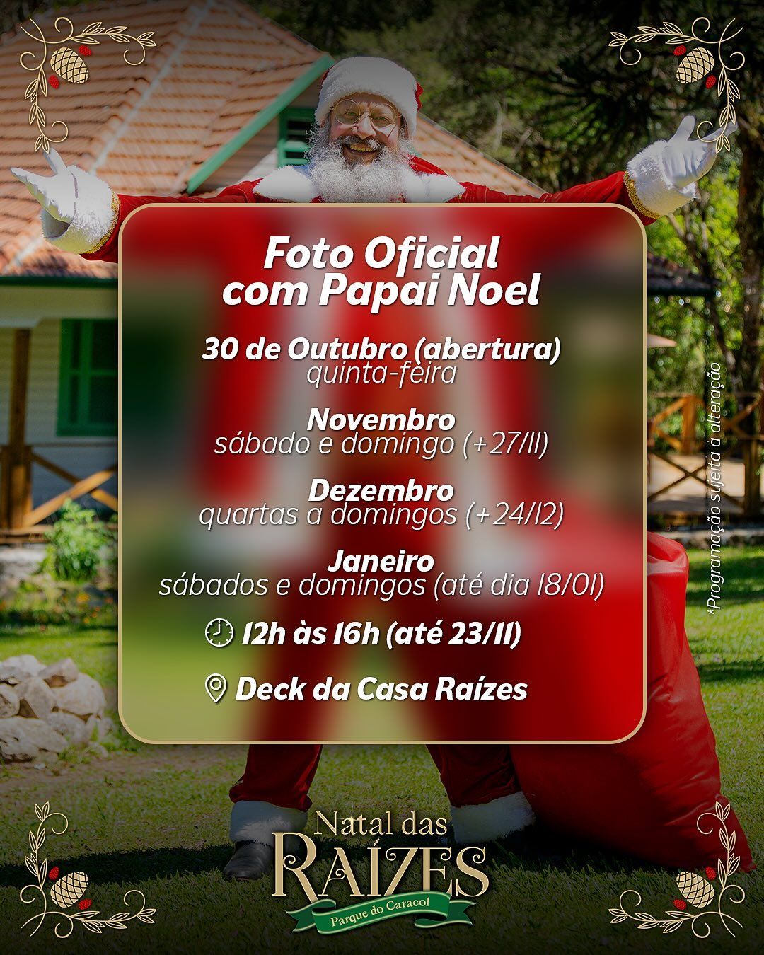 A visita do Noel será no dia da inauguração e aos sábados e domingos até 23 de novembro, das 12 às 16 horas. A partir de 27 de novembro, o novo Mirante da Cascata do Caracol também servirá de cenário para a tradicional foto com o bom velhinho. A atração ficará disponível de quinta a domingo, das 13 às 16 horas.