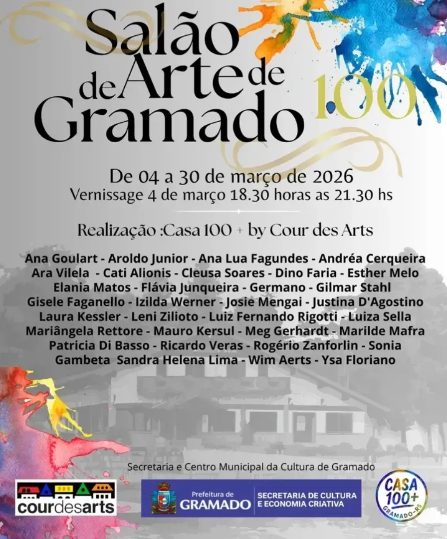 A Casa 100+ abre oficialmente sua temporada de exposições externas em 2026 com o Salão de Arte 100 de Gramado, cuja abertura acontece na noite do dia 04 de Março, na Secretaria Municipal da Cultura de Gramado, localizada na Rua Leopoldo Rosenfeld, 818, junto ao belíssimo Lago Joaquina Rita Bier.