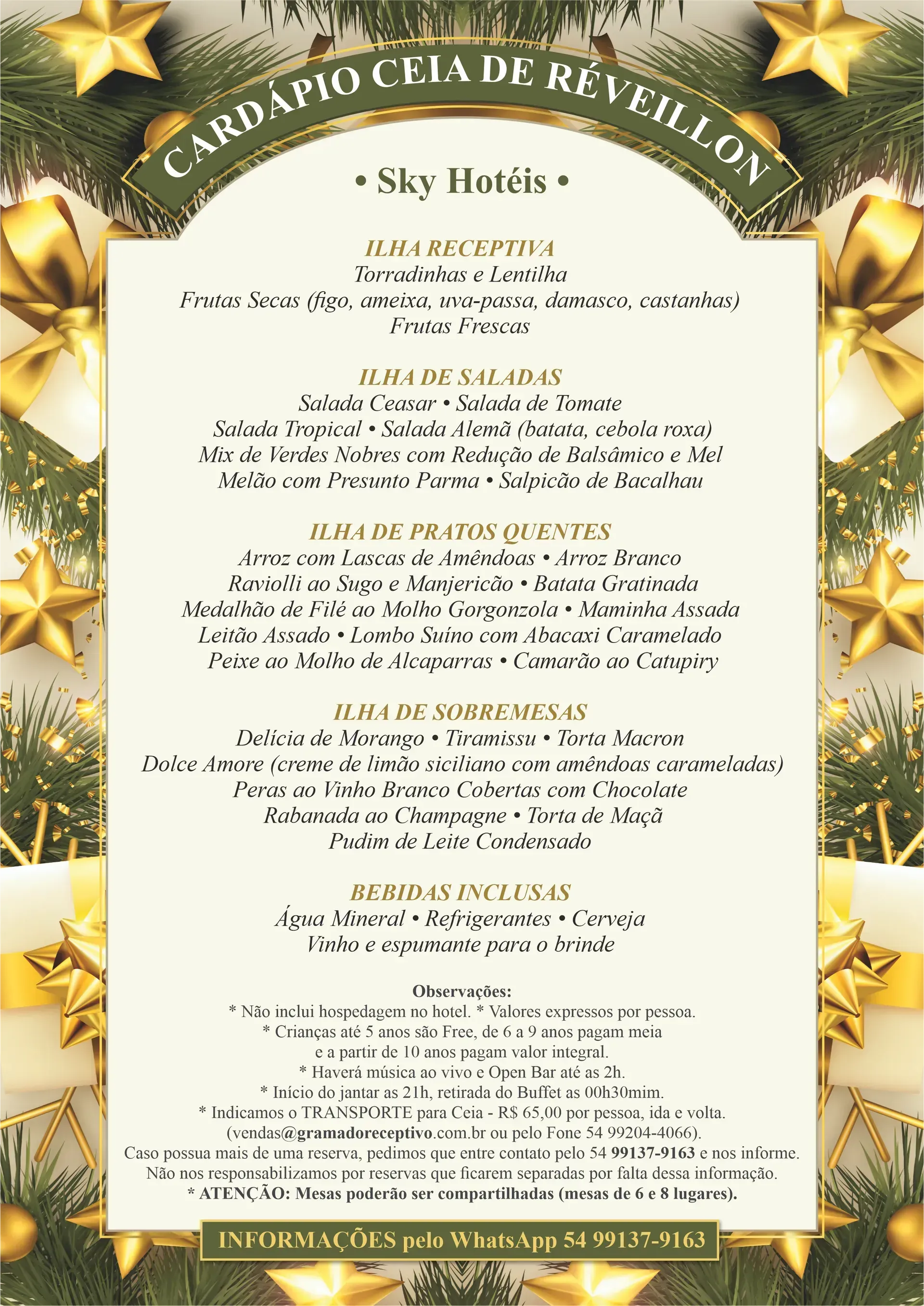 Prepare-se para receber o novo ano com muita animação na nossa Ceia de Réveillon. Teremos uma contagem regressiva emocionante, o espaço SKY KIDS GRATUITO para crianças de até 12 anos, música ao vivo para fazer você dançar a noite toda e, é claro, o nosso incrível Open Bar, garantindo que a diversão dure até às 2h da manhã!